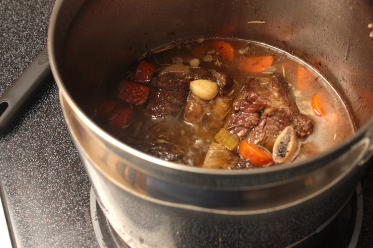 4) Place the beef ribs back into the pot, and add the herbs in. Then pour in the beef stock, and a pinch of salt.