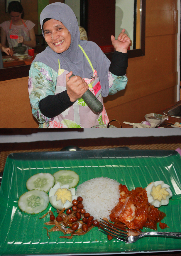 Since taking the class I’ve sampled nasi lemak and sambal udang at a few local restaurants, and I have to say that our version was the best I’ve had so far. I swear that lunch (and the leftovers that we ate for dinner) tasted better because we had cooked it ourselves. The more I discover here the more I realize how much I have left to taste of the diverse and dynamic cuisine in Malaysia. Truly experiencing Malaysian food requires full-on immersion and a leap of faith; sometimes the ingredients and flavors in a dish may be unexpected but they’re almost always gratifying. While I may never understand the appeal of durian, a local tropical fruit that smells and tastes like rotten garlic but that Malaysians consider a delicacy, I have found that my palate has expanded in ways I could never have imagined.
