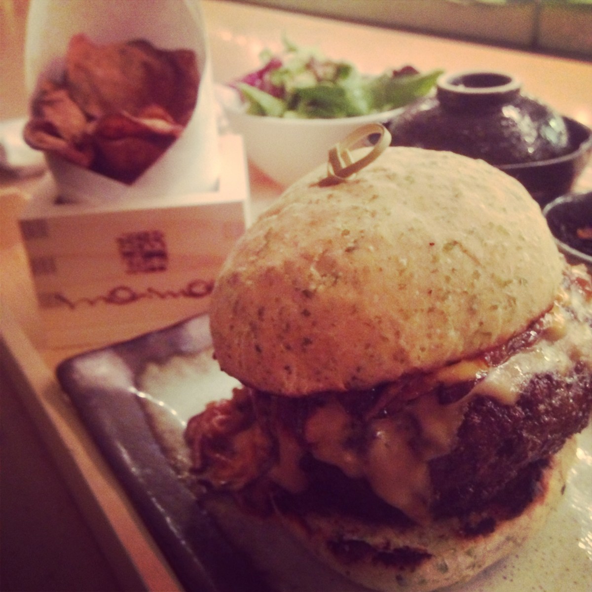 Morimoto: Burger Published February 24, 2014 at 2448 × 2448 in Restaurant Week is Afoot! ← Previous Next → Morimoto: Dry aged burger with miso Russian dressing, sake kasu soba ale cheese, soy-ginger shiitakes on a house made nori bun