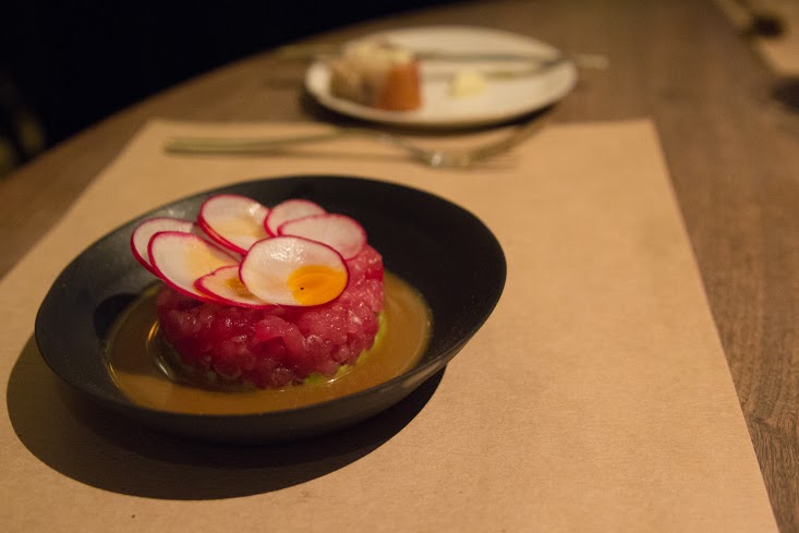 The Tuna Tartare is one of the few things on the Restaurant week menu that’s also on the actual Nougatine menu. I’m guessing it doesn’t take as much effort to prepare. It’s like having a huge portion of decent sushi, and I get really into it for the first few bites. But then the avocado mush starts blending into the tender tuna, which melds with the watery dressing a little too much. It all sort of slides straight from tongue to gullet. My teeth feel like they’re having an existential crisis. I start chomping radishes frantically.
