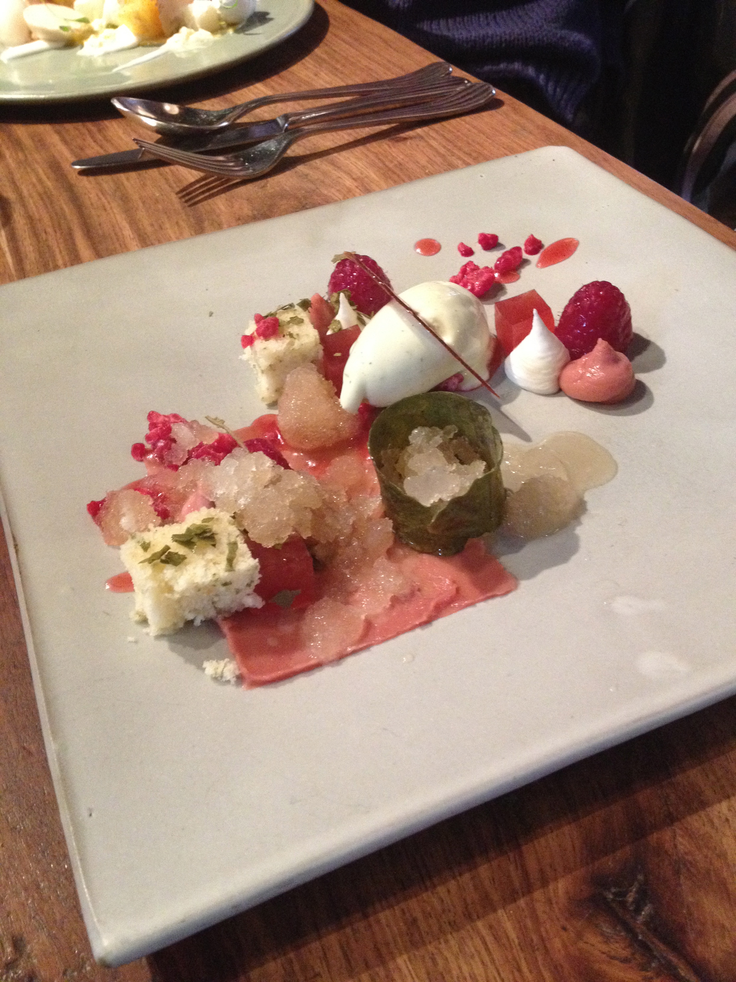 “Raspberries and Figs” – fig leaf chiffon cake, raspberry kombucha jellies, fermented kefir cream, amasi and fig ice cream, fig leaf granita