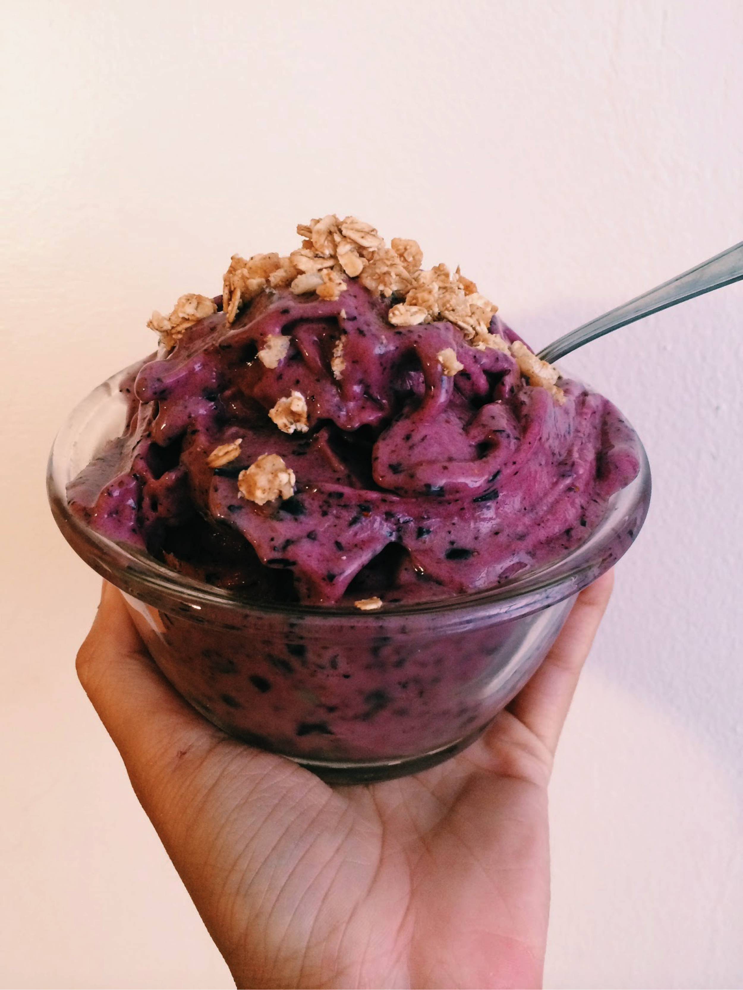 The most important part of the recipe is the freezing of the fruit. For starters, bananas are a must; their thick and creamy texture mimics dairy ice cream. Bananas are the basis for the ice cream, and then all supplementary ingredients help to flavor it. Any fruit being added to your ice cream should be frozen, and the longer it is left in the freezer the less watery and more compact of an ice cream will result. For easier blending, make sure to cut fruit before storing in the freezer, as shown above. Below is a vegan ice cream made from frozen blueberries and mangoes that I had stored for only four hours, which gave it more of a watery texture. For a thicker consistency, like the blueberry ice cream (fourth picture), consider freezing your fruit overnight. The ratio of banana to other fruit should be 2:1, for every one serving of other fruit, use two bananas and that will give you the creamiest consistency.