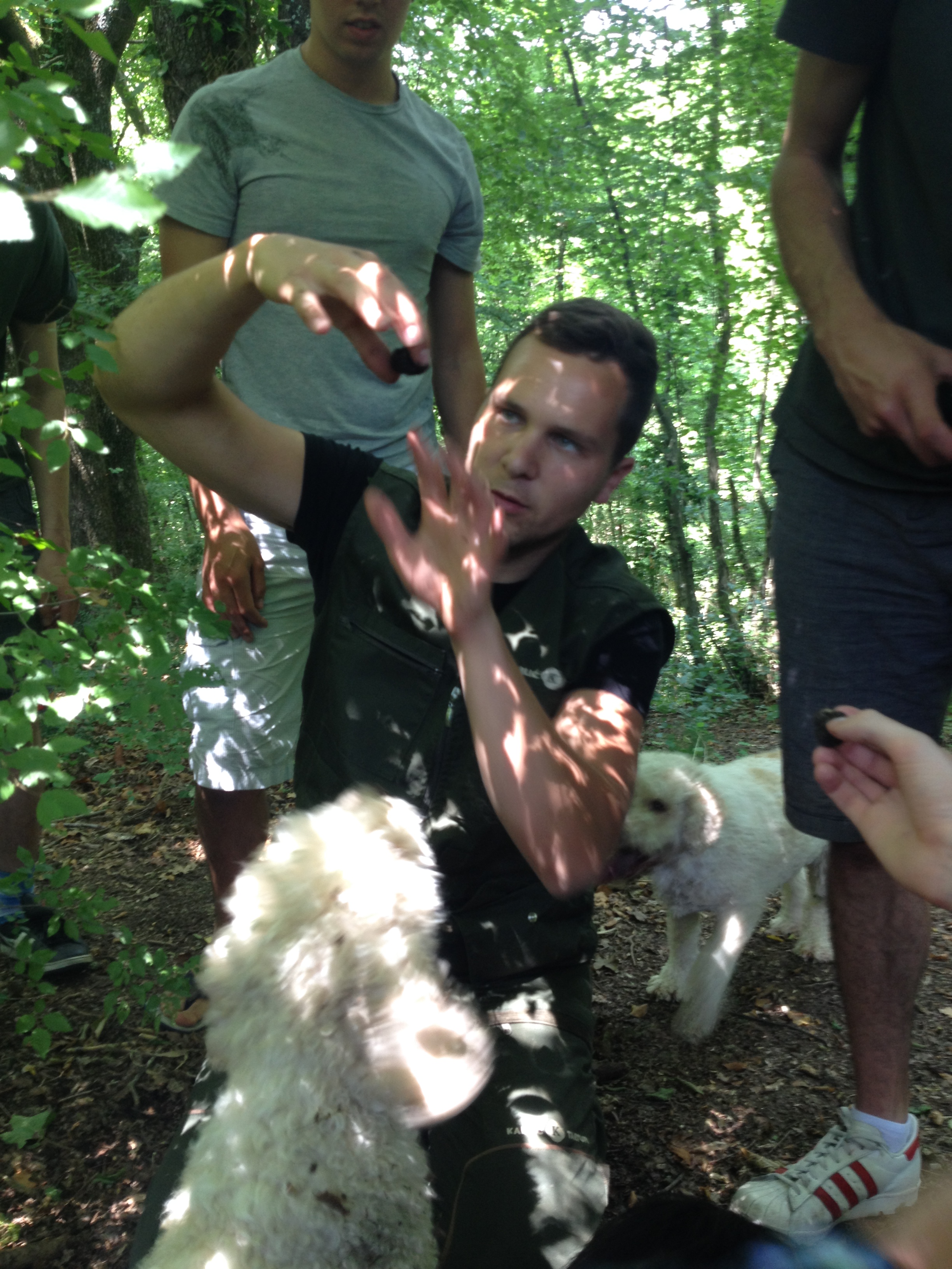 When we loaded the dogs into the car, or rather, when they raced to the backseat after their command, we set off for the Motovun Forest. There, we trailed behind the farm owner’s son as he pursued the dogs. They seemed to go wild with their noses glued to the ground and their tails wagging furtively. They ran ahead of us but never strayed far and began digging whenever they suspected a truffle. After about fifteen minutes we found our first one.